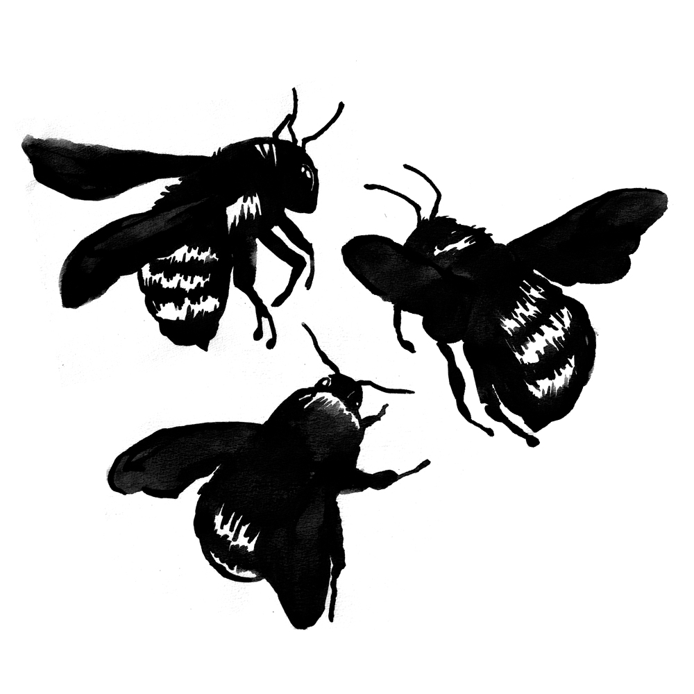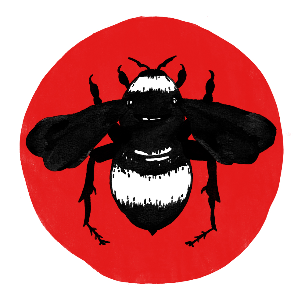 I took inspiration from literature, and I found the book History of Bees by Maja Lunde particularly interesting. I wanted to find a symbol that would not only convey a feeling of power, but also connotations of collectivism and strength by unity. I sketched both roses and bees, and ended up making several drafts with different types of bumblebees. Bumblebees are relatively small creatures, but equipped with stings, and so together they can defend themselves against enemies that are many times larger.