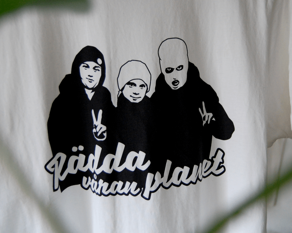 For the merchandise design, AG Hedvig wanted to use a motive of the famous climate justice activist Greta Thunberg, together with two Swedish gangster rappers, Greekazo and 1.Cuz. The text is a quote by Greekazo, meaning “Save our planet.”