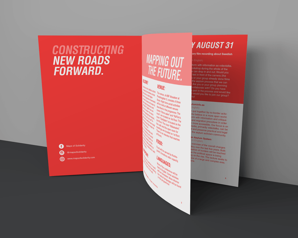 This project includes graphic design made for the international conference Maps of Solidarity, held in Malmö during late summer 2019. The work included several printed products: the official event poster, design for event merch bags and a folder with information for the participants of the conference. The work also included material for uploading on the web and social media, Facebook and Instagram, including presentation of speakers, talks and workshops at the event.