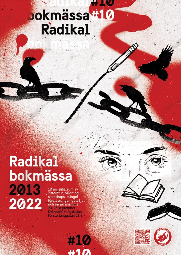 Graphic design commission for the 10th annual event of Radikal bokmässa, an alternative bookfair in Gothemburg, organized by Syndikalistiskt Forum. The work included poster design, for printing in A2 format, and banner art and illustrations for digital platforms such as Facebook and Instagram.